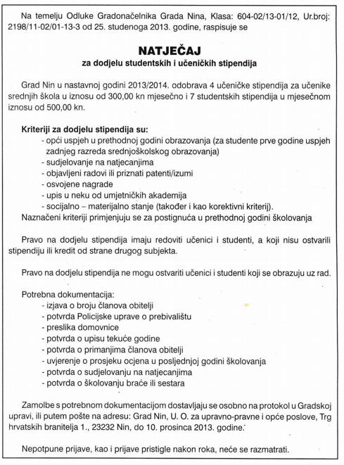 Početna stranica > Baza natječaja > Stipendije Grada Nina